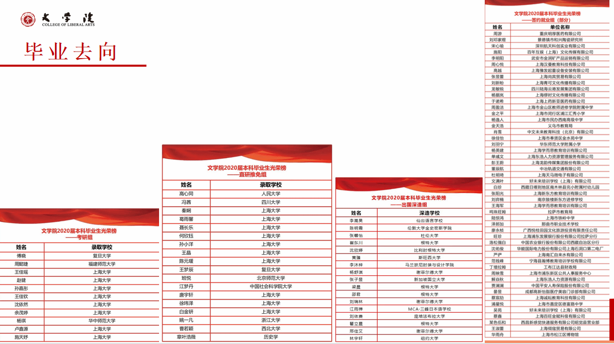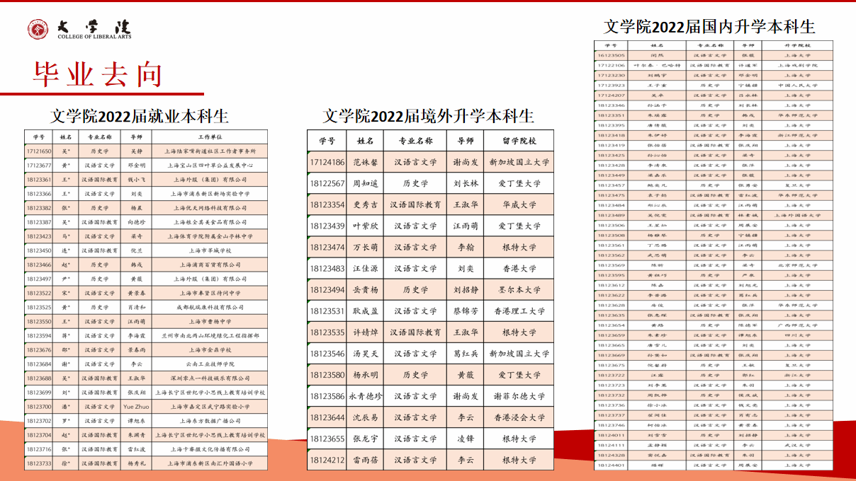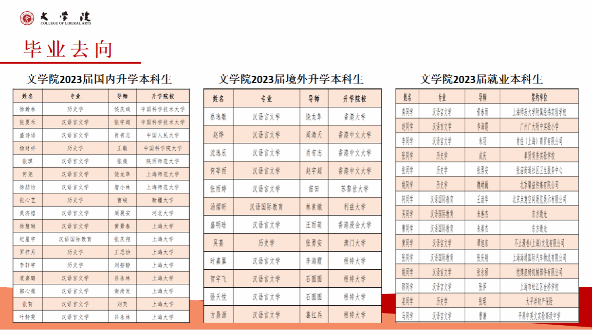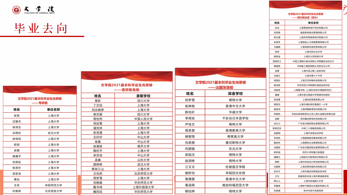 红足1一世足球官网入口2023年的本科毕业生的就业率为89.66%,就业方向主要集中在教育、机关事业、文化艺术、出版编辑等行业和领域,就业行业的分布相对较广,其中部分优秀毕业生入职华为、腾讯、振华重工等全球五百强企业。近年来,超过30%的本科生毕业后选择继续深造,其中2023年继续深造比例达47.4%。多人考取或免试直升复旦大学、中山大学、中国人民大学、武汉大学等国内名牌大学。出国(境)深造比例也在持续提升,2023年出国(境)学生中,50%进入QS全球排名前100的国际一流高校攻读硕士学位,香港大学、香港中文大学、利兹大学、苏黎世大学、诺丁汉大学等。