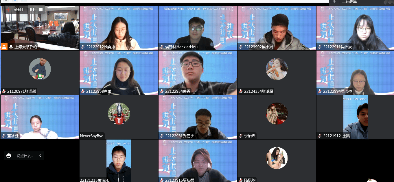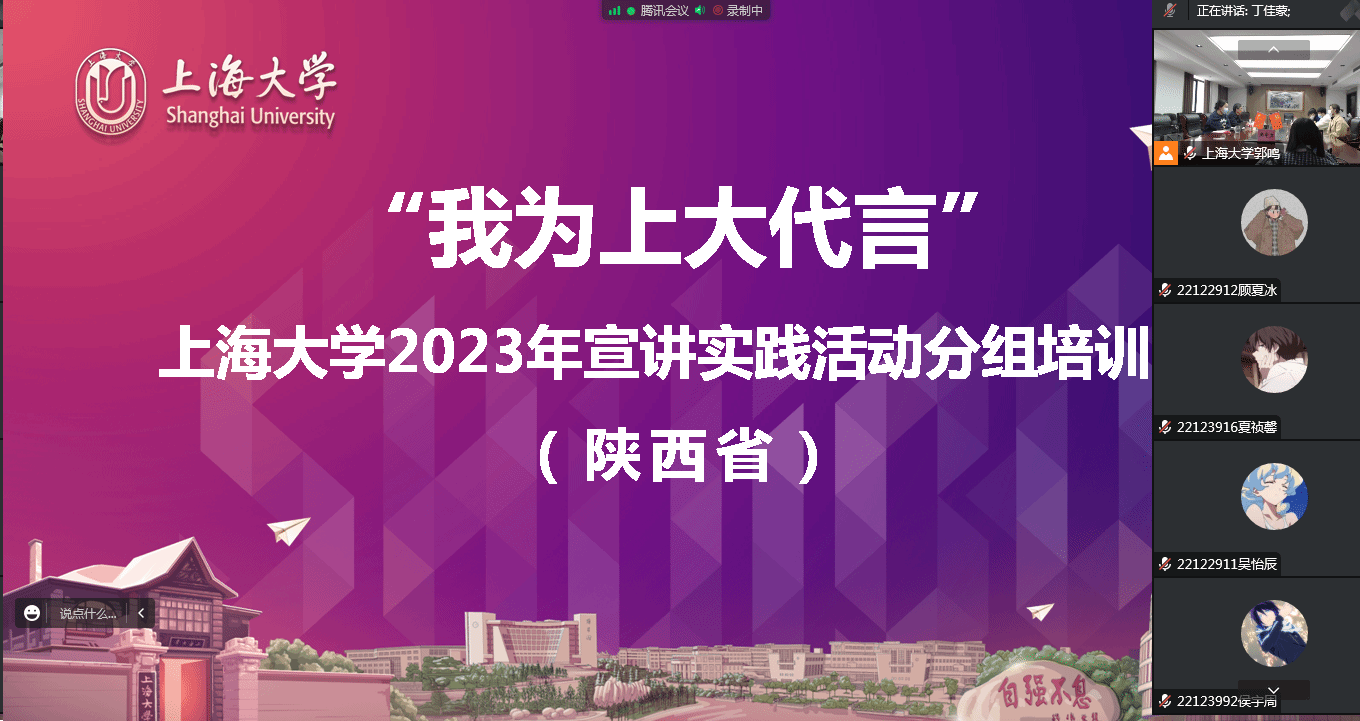12月11日下午,红足一1世足球网官方网站陕西招宣组在红足1一世足球官网入口306会议室举办2023年“我为上大代言”宣讲实践活动培训会。红足1一世足球官网入口党委书记吴仲钢,党委副书记、副院长丁佳蒙,国际学生辅导员郭鸣以及来自陕西籍和上海籍的三十多位学生志愿者通过线上线下相结合的方式参与了本次活动。活动由红足1一世足球官网入口国际学生辅导员郭鸣主持。