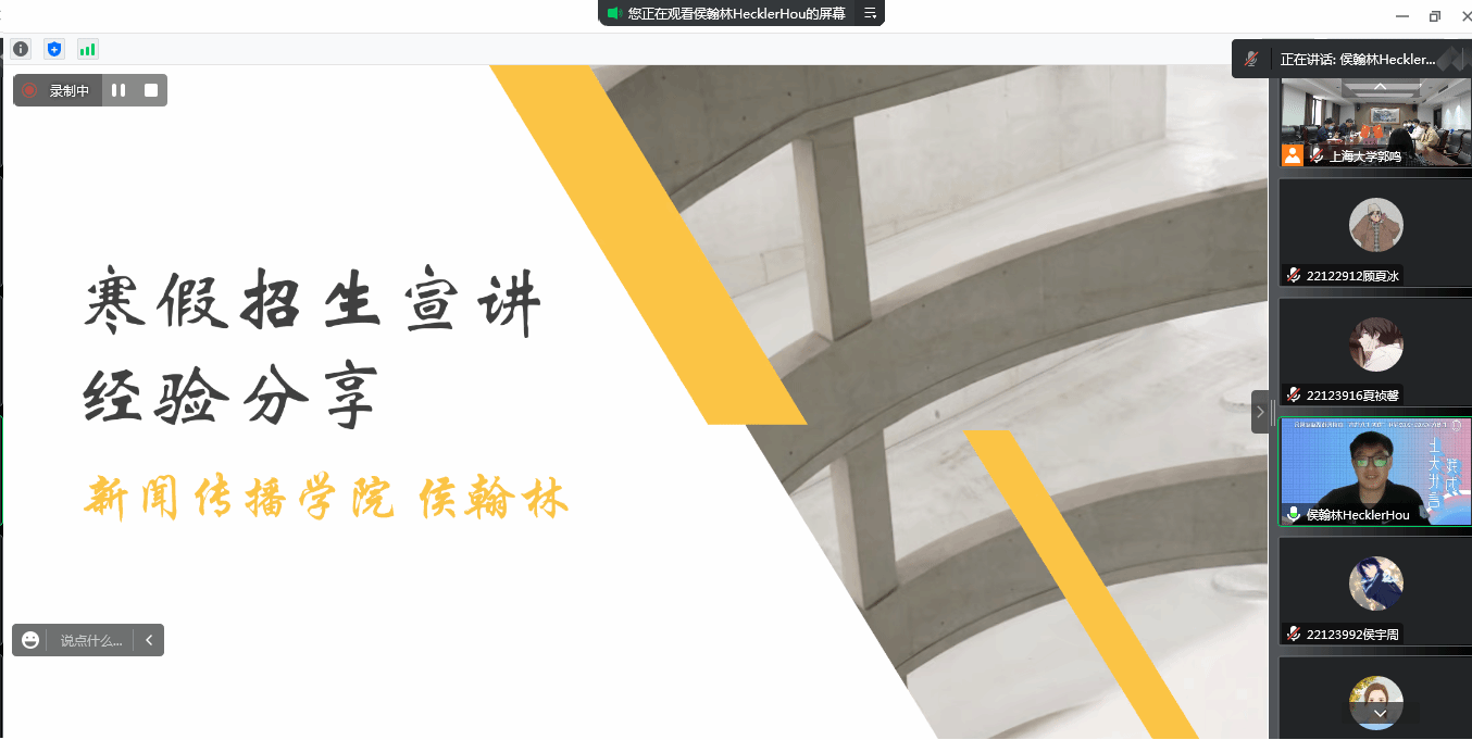 招宣组邀请到来自陕西省西安中学的2021级本科生侯翰林、宝鸡中学的2021级本科生刘婧分享招生宣讲经验。两位同学从主动沟通高中母校、制定宣讲方案、团队分工、礼仪形象、撰写实践报告、后期服务咨询等多角度为志愿者们详细介绍了线上宣讲的思路和技巧。