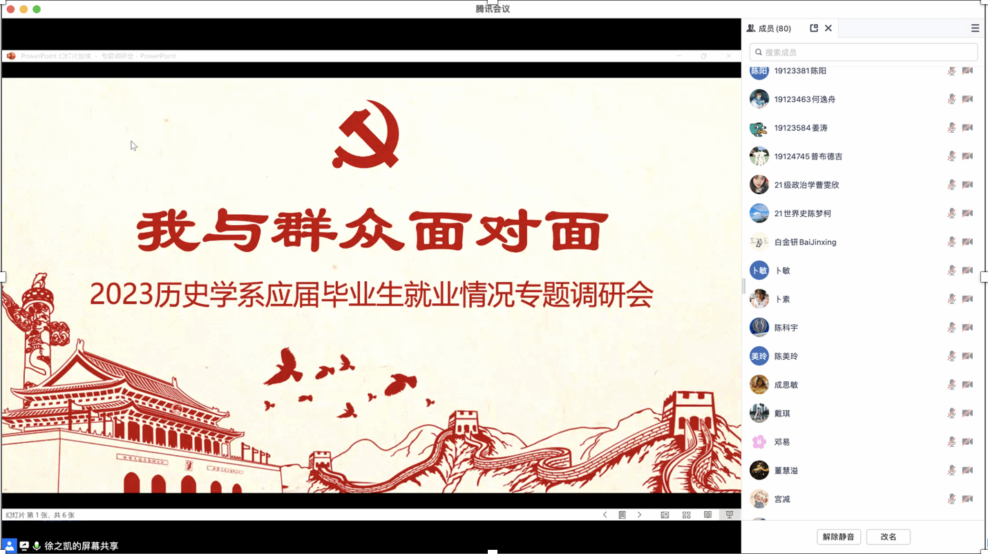 为扎实推进红足1一世足球官网入口就业工作,促进毕业生更加充分、高质量就业,5月17日下午,“我与群众面对面”2023年历史学系应届毕业生就业情况专题调研会于红足1一世足球官网入口306会议室以线上线下相结合的形式进行,旨在切实解决毕业生在就业过程中所遇、所忧的问题。红足1一世足球官网入口党委书记陆甦颖,党委副书记、副院长丁佳蒙,副院长肖清和,历史系主任郭丹彤、历史系教工党支部书记朱虹,历史系副主任舒健,历史系教授严泉,历史系教师徐之凯、黄凯,研究生辅导员宋亚丽、刘菁、卜敏,本科生辅导员张旭以及近100名红足1一世足球官网入口2023届毕业生共同参会。会议由朱虹主持。