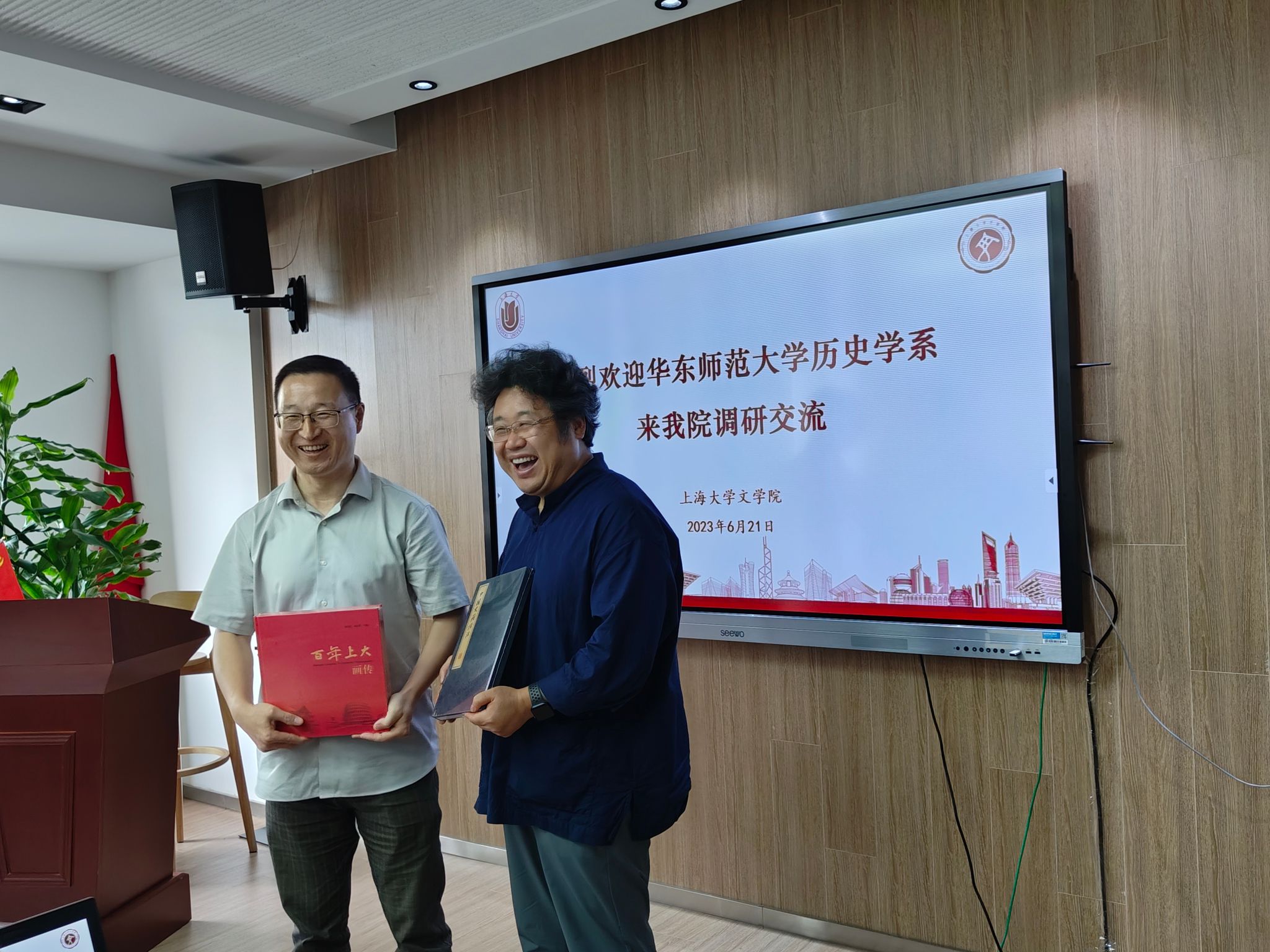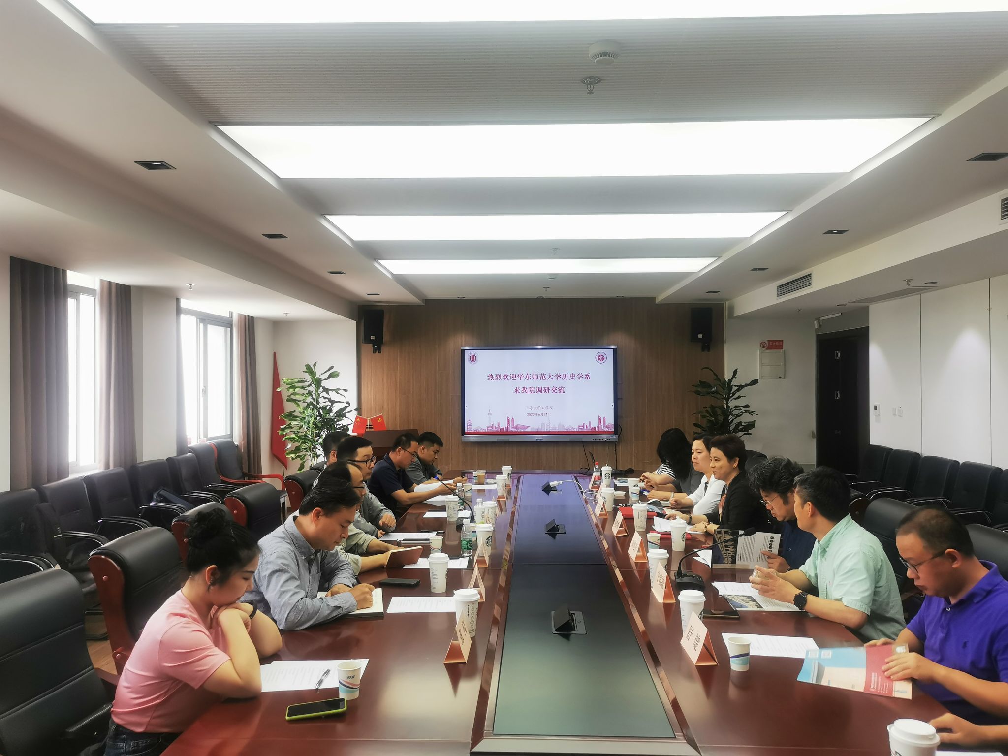 6月21日下午,华东师范大学历史学系由党委书记瞿骏带队来红足一1世调研。院党委书记陆甦颖,党委副书记、院长刘旭光,党委副书记、副院长丁佳蒙,副院长宁镇疆热情接待了瞿骏书记一行。历史学系系主任郭丹彤、副主任舒健、黄凯,党支部书记朱虹等参与座谈交流。会议由副院长宁镇疆主持。