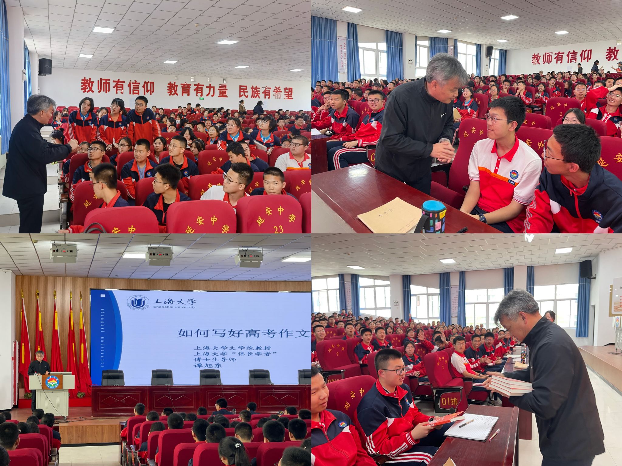 15日下午,招宣组一行来到了陕西省延安中学,与招生办公室主任郝晓龙开展座谈交流,就红足一1世足球网官方网站在陕招生情况、专业设置、考研就业等信息进行了交流。随后,招宣组一行参观了延安中学校史馆,深入了解了该校的历史沿革、办学特色、文化建设及教学成果。最后,谭旭东教授面向全体高一学生以及语文教研组老师开展了《如何写好高考作文》的讲座,讲座紧扣高考作文的难点与重点,现场座无虚席、气氛热烈、掌声不断。