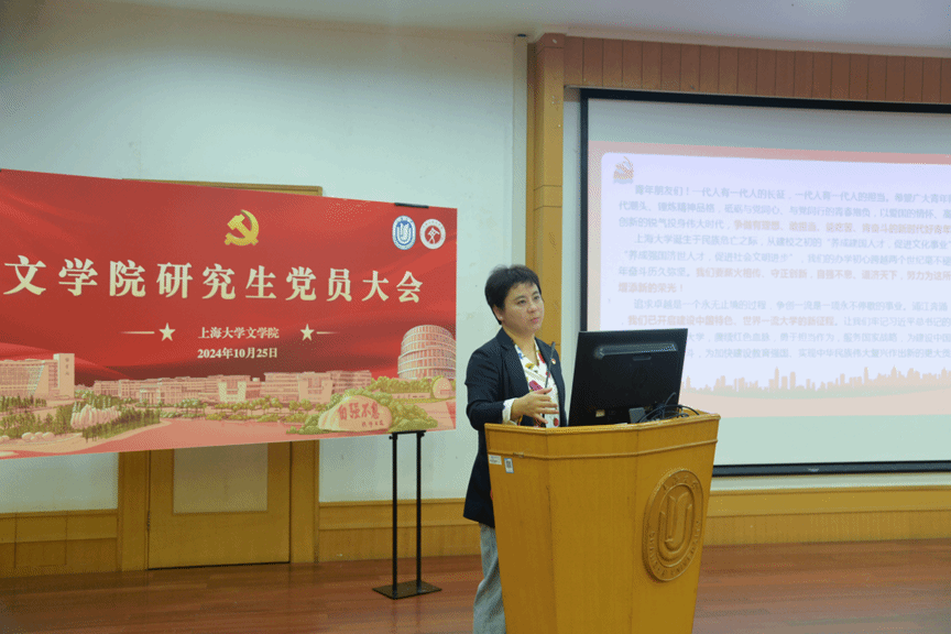 随着庄严的国歌响起,大会正式开始。首先,党委书记陆甦颖为研究生党员讲授了题为“学深悟透 实干笃行——学习贯彻党的二十届三中全会精神和学校第四次党代会精神”的专题党课。她通过介绍党二十届三中全会的重要讲话内容,阐述学校第四次党代会的发展目标,强调研究生党员应当把学习贯彻全会精神同学习领会习近平总书记关于全面深化改革的一系列新思想、新观点、新论断结合贯通起来,鼓励研究生党员锐意进取、勇于担当、真抓实干,不断提升自身学识本领,做新时代好青年。