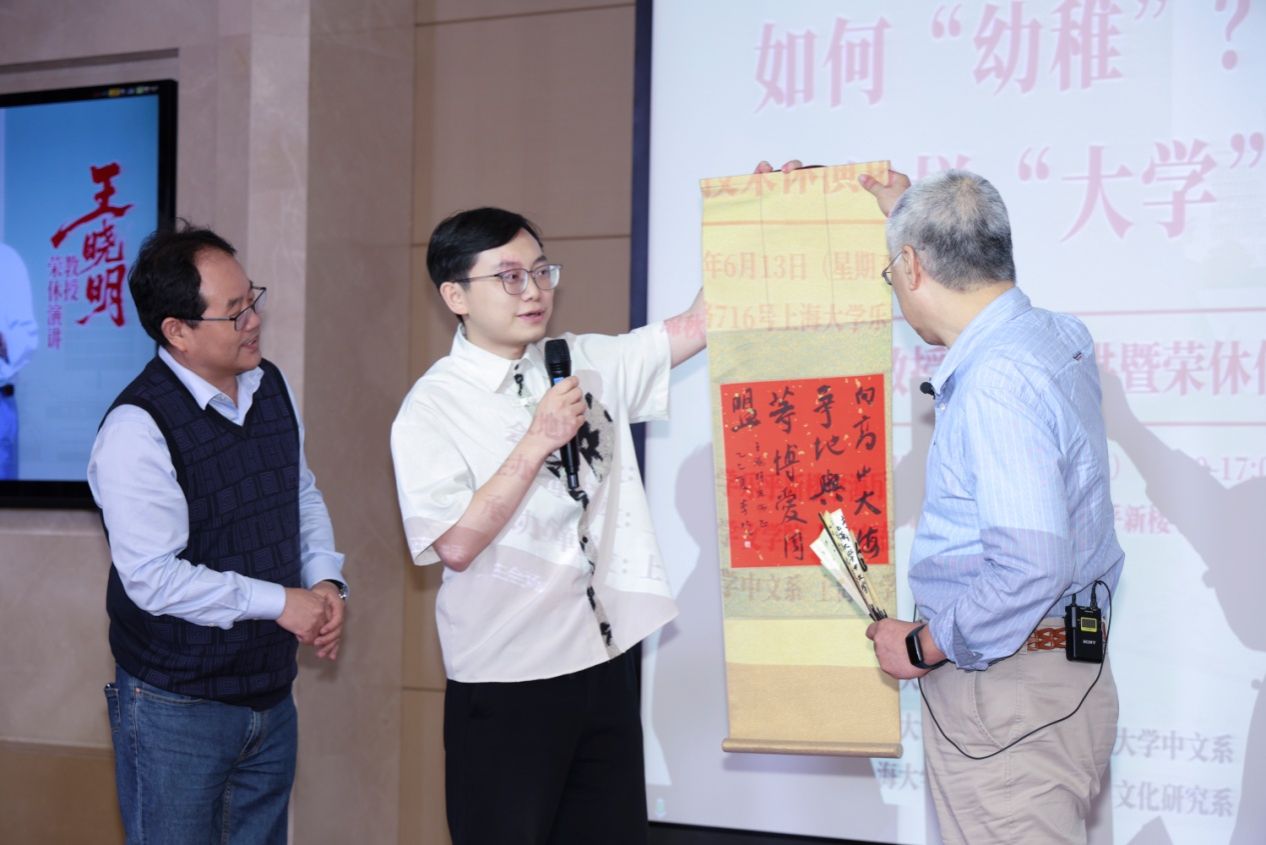 活动第二个环节主要是王晓明教授的荣休演讲。王晓明教授在《“如何‘幼稚’,怎样‘大学’”》主要讲了两部分内容:一方面回忆过往,以别人对他的“幼稚”评价入手回顾了自己的学术成长;另一方面是立足当下,剖析“大学”的挑战和应对。