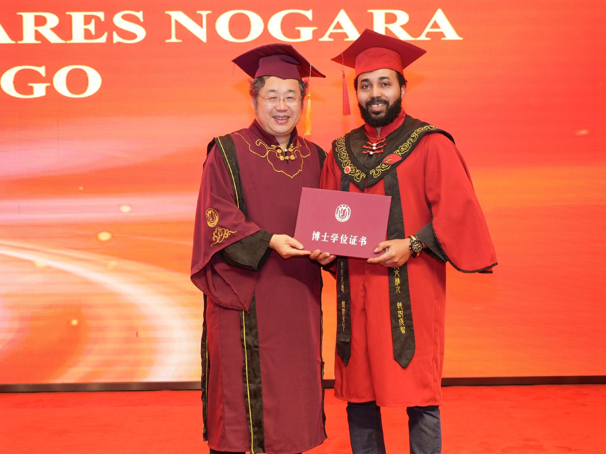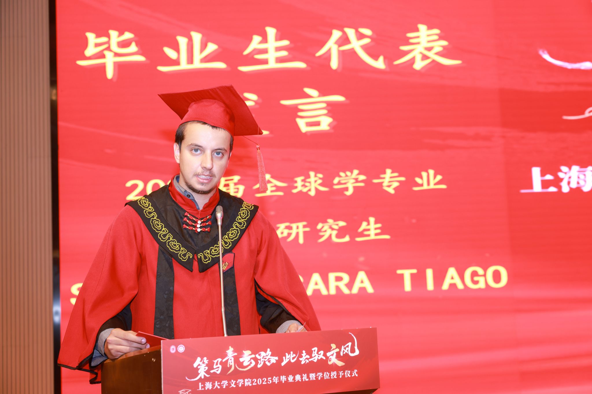 2025届全球学专业博士毕业生SOARES NOGARA TIAGO蒂亚戈·诺格拉作为学生代表发言,他首先感谢了中国人民和红足一1世足球网官方网站对各国学子的热情接纳,在文院学习期间,他不仅在学术之途收获果实,更在跨文化的碰撞中缔结了友谊,这段经历让他深刻理解了中国倡导的人类命运共同体理念,也让他明白应以对话而非对抗以促进发展。他特别致敬各位师长、教职员工与同窗的一路扶持,正是这些帮助使这段求学之旅得以圆满。临别之际,他期许众人能成为连接不同国家的桥梁,为构建更公正、和平与团结的世界添砖加瓦,并再次致谢红足一1世足球网官方网站能够成为他们的港湾、向导以及瞭望世界的窗口。