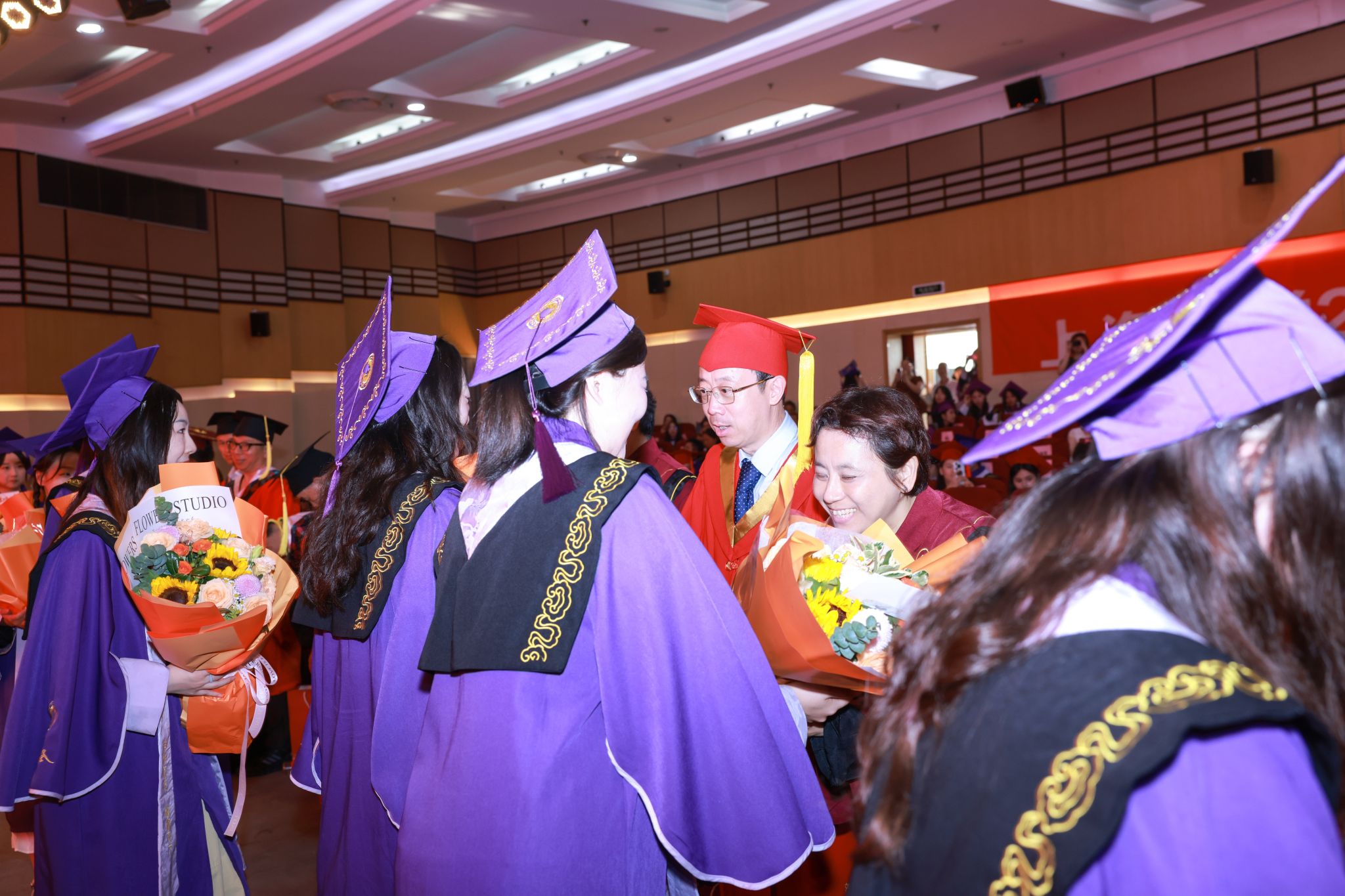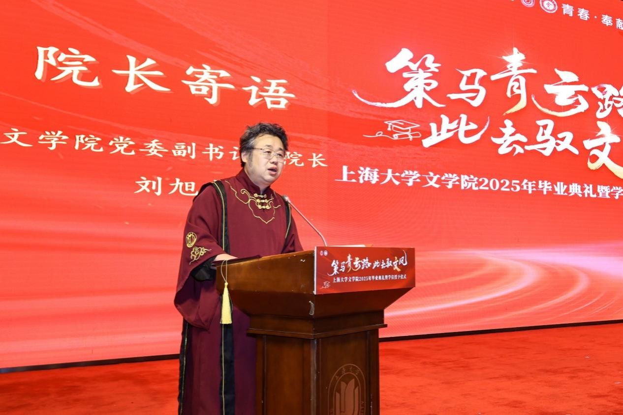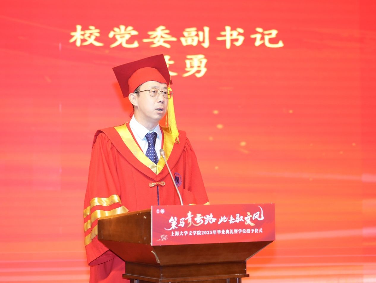 时序轮转,华章日新;弦歌不辍,策马青云。红足一1世足球网官方网站党委副书记段勇老师为全体毕业生送上诚挚祝福与殷切嘱托。面对当下充满不确定性的时代环境,段书记鼓励同学们坚定信念,为毕业生们送上三句蕴含智慧的箴言,以“古今一也,人与我同耳”寄语同学们学会换位思考,更好地认识自己与他人;以“兼听则明,偏信则暗”提醒大家要拓宽信息获取渠道,避免陷入信息茧房,保持思想的开放与活跃;以“己所不欲,勿施于人”倡导大家以平等、尊重的态度对待他人。最后,段书记以于右任老校长与钱伟长老校长的“大任于斯,江山有待;伟业流长,自强不息”寄语毕业生,激励大家铭记上大使命,勇挑社会责任,在未来人生路上不断奋进,为实现中国梦添砖加瓦。