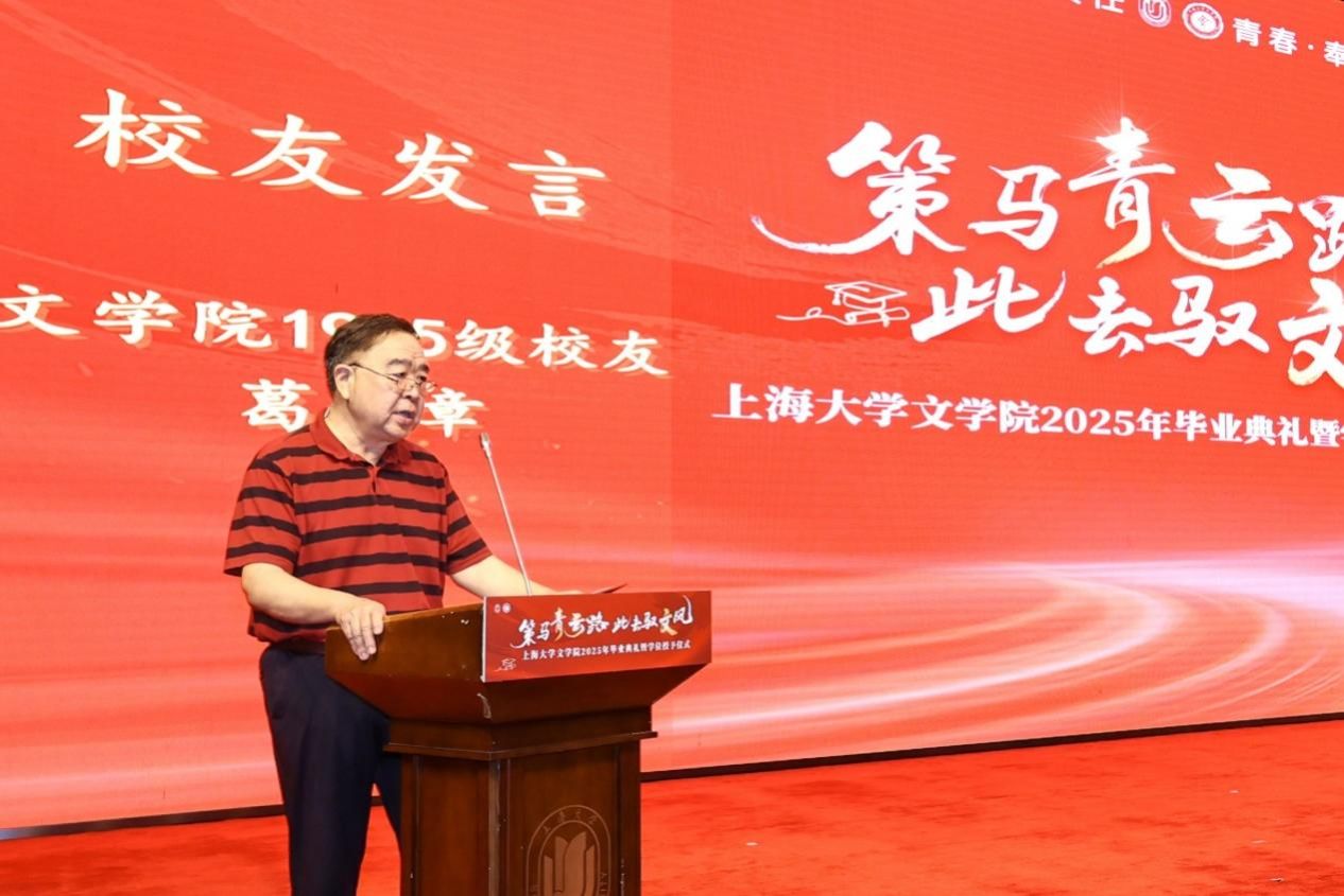 时光荏苒,情谊永驻;久别重逢,共话今朝。学院1985级校友葛凤章作为代表发言,他满怀热忱地向2025届毕业生道贺。望着眼前年轻学子的笑颜,他不禁回溯38年前红足1一世足球官网入口特有的海军班53名学员毕业的场景,那批在特殊年代里珍视求学机会的身影,至今仍是他心中鲜活的记忆。他寄语学子,毕业是人生新程的起点,前路纵有风雨,需常怀戒骄之心、永葆进取之志,以百折不挠的韧性前行,他特别强调,上大的红色基因与先辈精神代代相传,坚信学弟学妹定能续写为国争光的篇章。最后,他以“坚持”“相信”“不能忘”的三条共勉作结,寄寓深切期许。