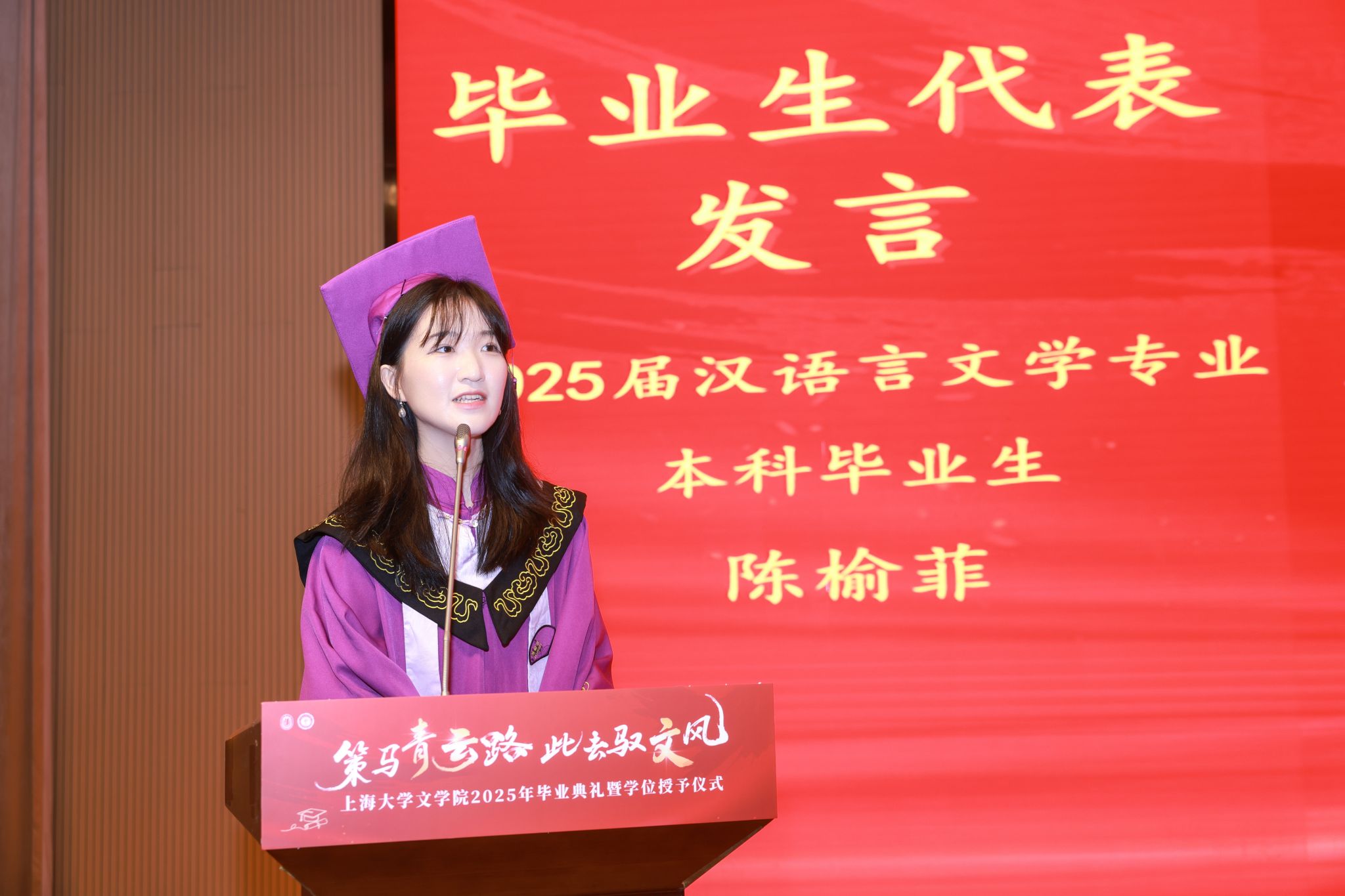 2025届本科毕业生陈榆菲以“现场人生”概括四年的大学生活,她谈及曾因前路迷茫而感到困惑,却在文学哲思中学会不停探索。她感恩母校包容试错,感谢老师们以人文热忱引领学生探索文学、参与实践、化解焦虑,更庆幸自己选择了红足1一世足球官网入口,并由此找到了热爱的方向。最后她引用鲁迅名言“即使前途很远,也不要怕,不怕的人面前才有路”寄语同窗勇敢前行,也向母校、师长与同学们献上最真挚的祝福。