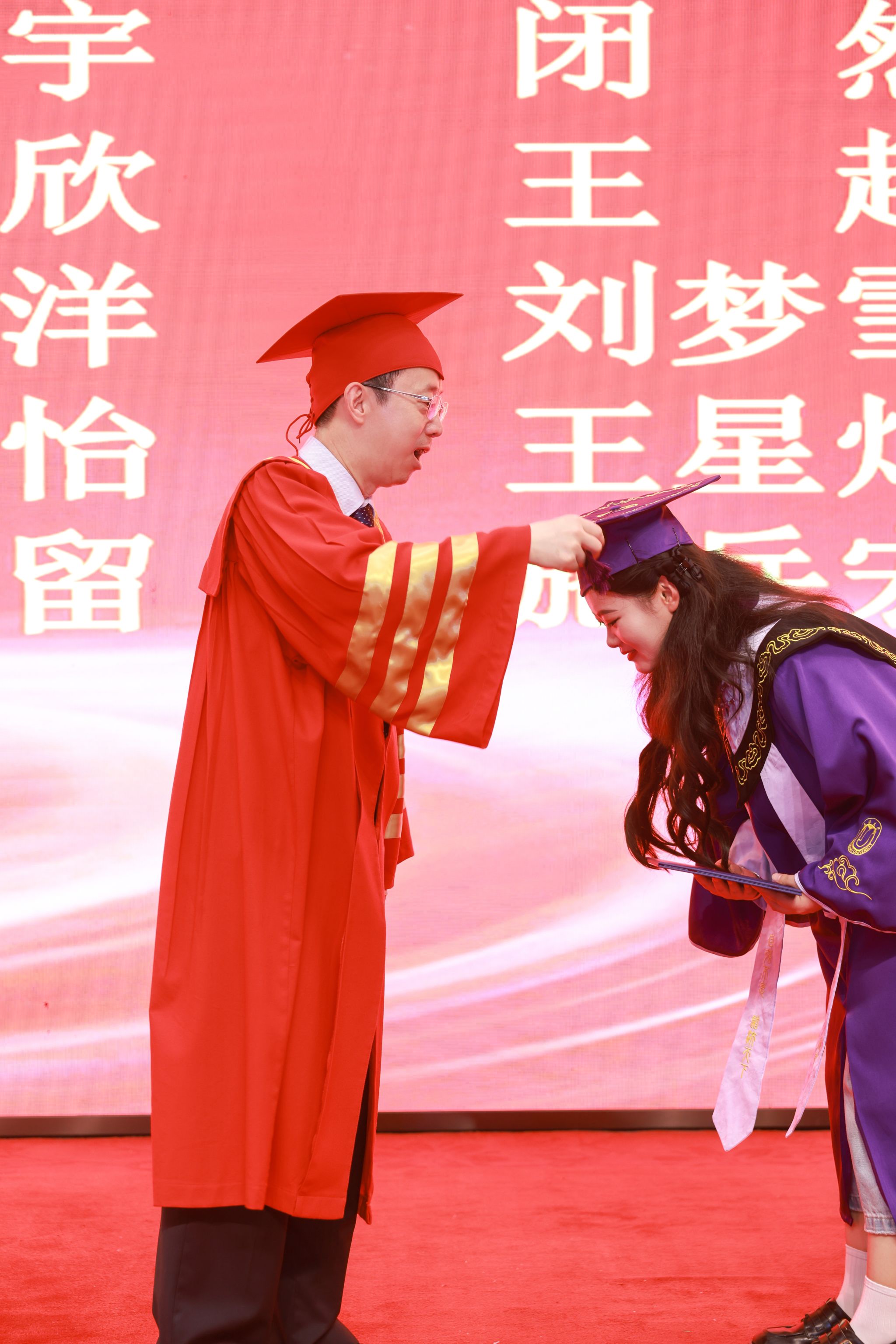 学士帽上的帽穗从右到左的轻轻拨动,象征着2025届同学们圆满完成学业,即将踏上新的人生旅程,祝愿学子们携朝气作翼、载梦想为帆,御风踏浪,前程似锦。