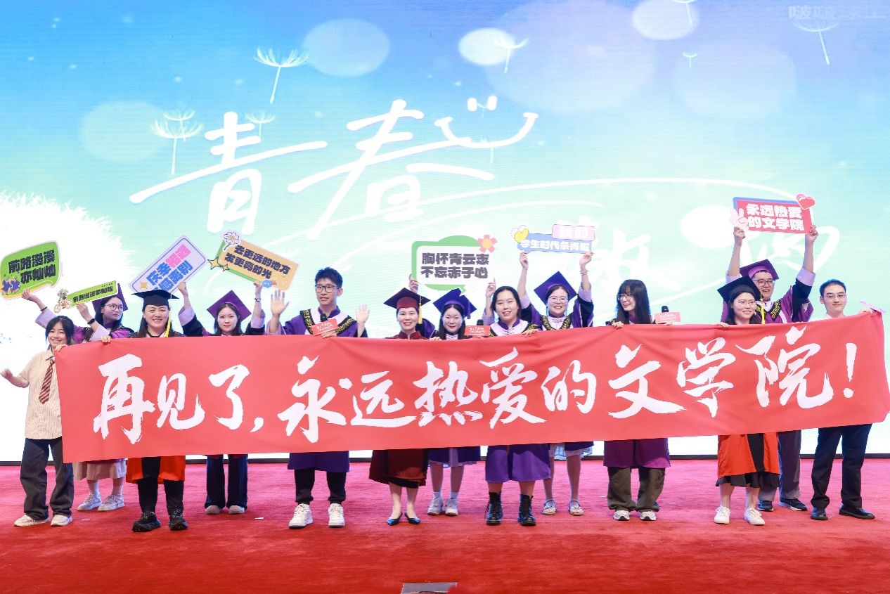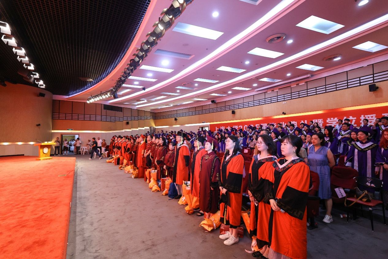 院旗、院徽承载着美好的祝福,传承着一代代的文心。2025届本科毕业生张昕瑜同学和研究生毕业生孙浩颖同学分别将院旗、院徽交到新生代表刘思达、黄思文同学手中,象征着文心与文脉的赓续传承。随后,全体师生起立,奏唱中华人民共和国国歌,为本次毕业典礼拉开了序幕。