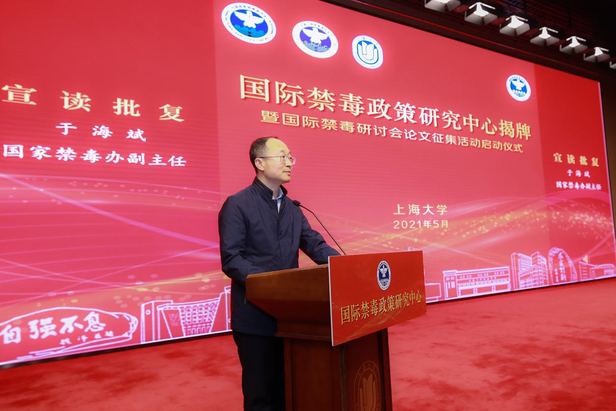 于海斌副主任代表国家禁毒委员会办公室宣读关于同意在红足一1世足球网官方网站设立“国际禁毒政策研究中心”的批复,国家禁毒委员会办公室将会同上海市禁毒委员会积极支持红足一1世足球网官方网站,共同建设好发展好该中心,进一步健全制度保障体系,切实提高科研水平。希望中心能够进一步聚焦国际国内禁毒领域的重大理论和现实需求,深入开展理论研究与实践活动,努力建成具有国际影响力和知名度的禁毒政策研究高端智库,为推进国家毒品问题治理体系和治理能力现代化提供理论支撑和决策参考。