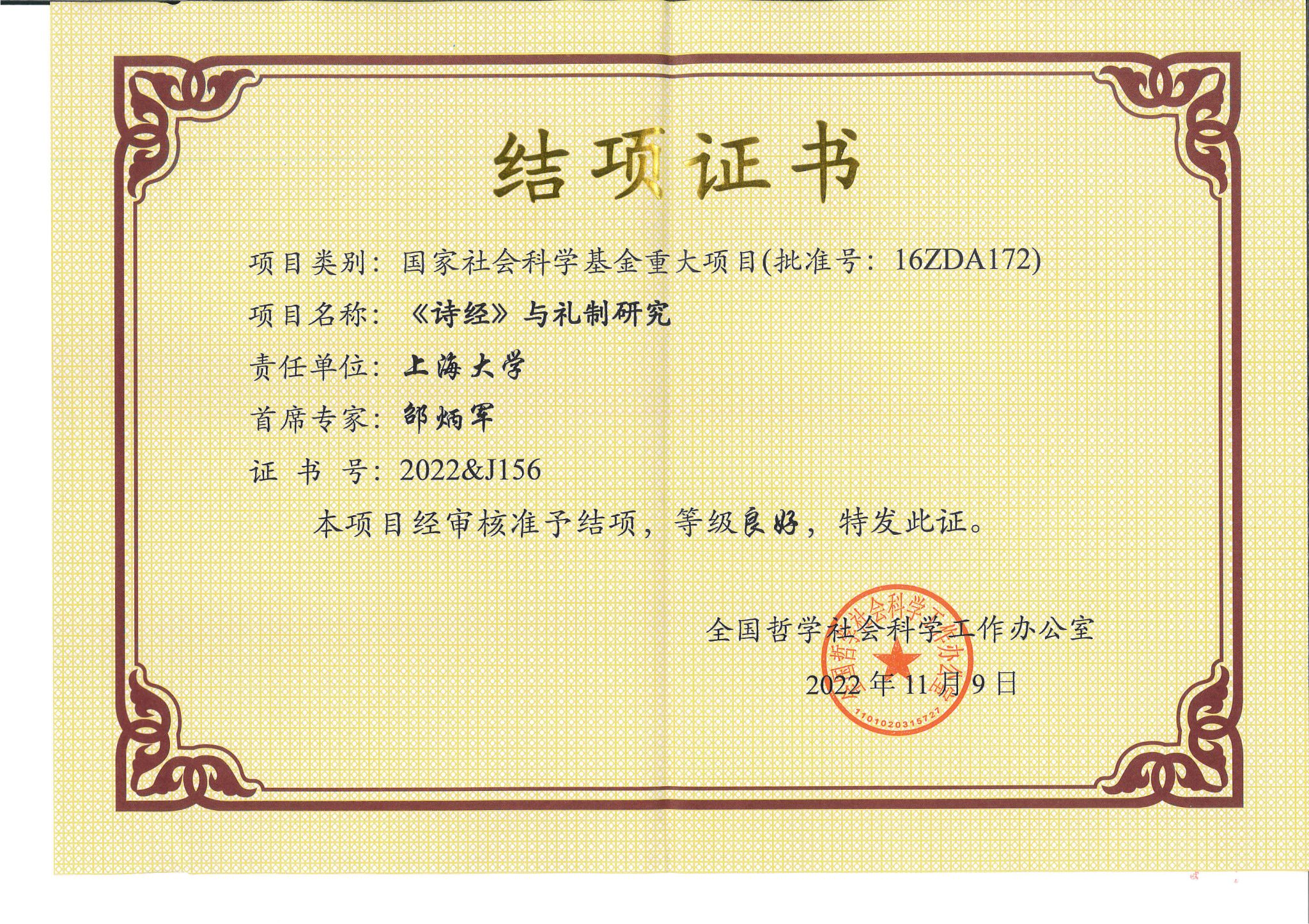 国家社科基金重大项目“《诗经》与礼制研究”(16ZDA172)于2022年10月8日上午召开结项鉴定会;11月9日,全国哲学社会科学办公室通过项目鉴定,并给予“良好”等级评定(2022&J156)。