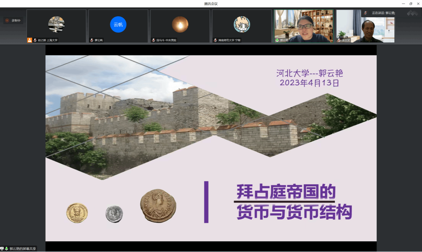 4月13日,历史学系世界史学科及青云书院主办“中东历史上的经济与文明”系列讲座第二讲,河北大学历史学院郭云艳副教授在线为一百余名听众作了精彩的学术报告。郭云艳老师的主要研究方向为拜占庭钱币、希腊近代史和中西交通史,她主持和参与了多项国家社科项目,出版专著《罗马-拜占庭帝国嬗变与丝绸之路:以考古发现钱币为中心》(2022),出版译著《希腊:现代进程,从1821年至今》(2008)等,在中文和西文刊物发表论文近30篇,其中以拜占庭钱币等领域的研究最受关注。