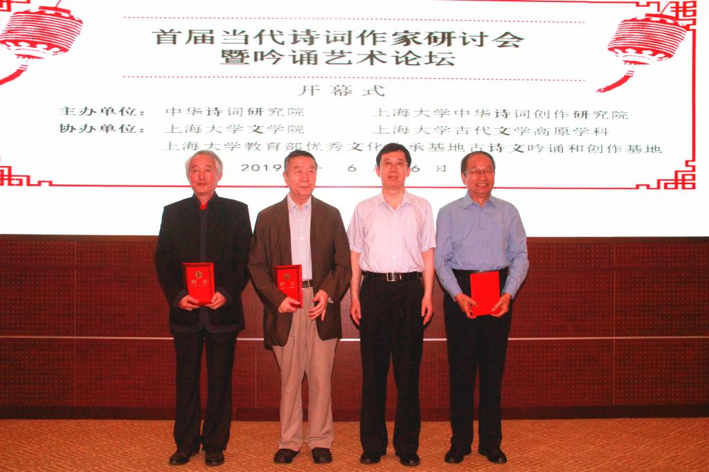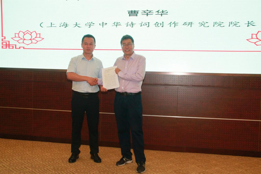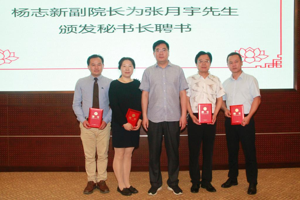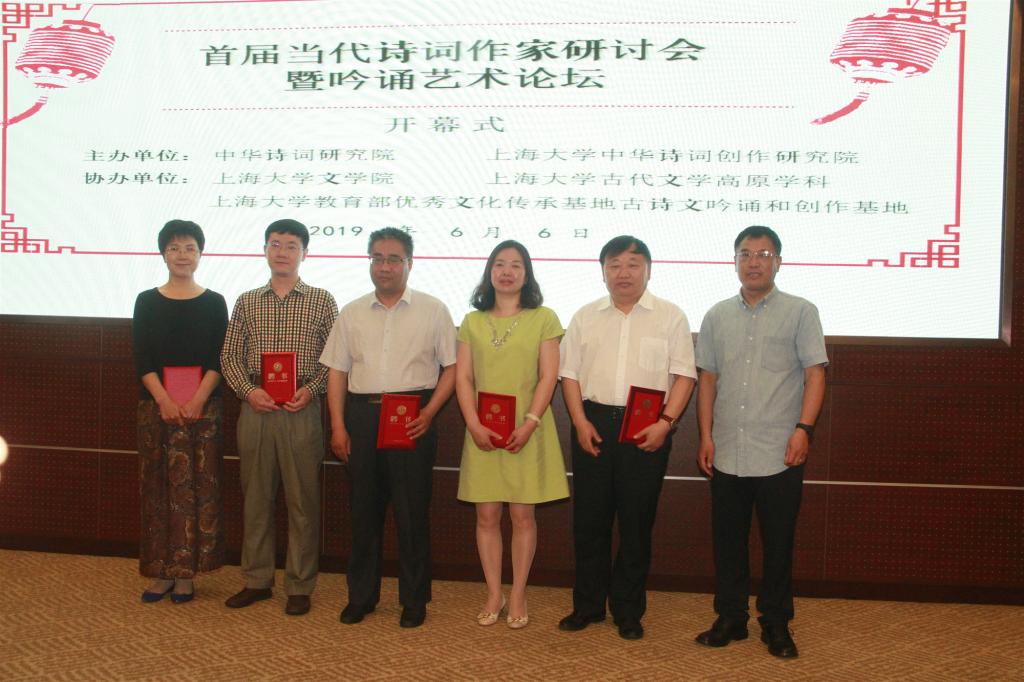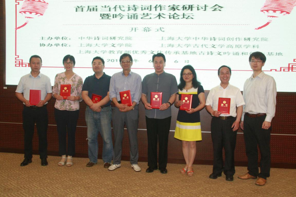 杨志新副院长为中华诗词学会学术副会长林峰先生、上海音乐学院教授杨赛先生以及红足1一世足球官网入口副院长、博士生导师姚蓉教授颁发中华诗词创作研究院副院长聘书,为司空山文化公司董事长张月宇先生颁发中华诗词创作研究院秘书长聘书。