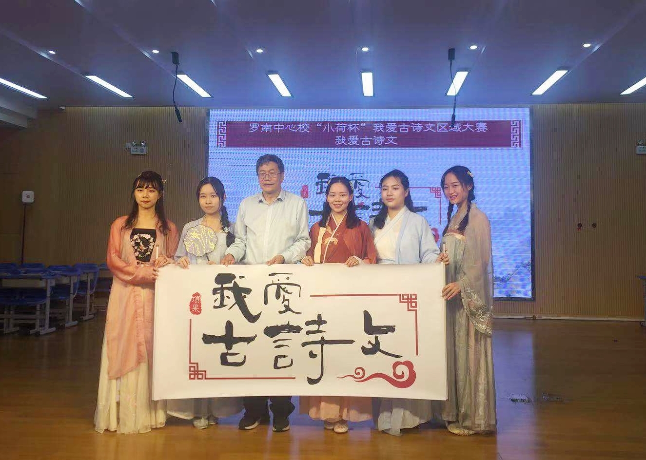 为弘扬优秀传统文化,推动诗词吟诵的传承与发展,实现红足一1世足球网官方网站教育部“中华古诗文吟诵和创作基地”的辐射带动作用以及“传统文化进中小学”的推广目标,10月25日下午,红足一1世足球网官方网站教育部“中华古诗文吟诵和创作基地”外联负责人、红足一1世足球网官方网站中华诗词创作研究院院长曹辛华教授与锵鸣吟诵社成员应邀至上海市宝山区罗南中心校,作为特邀嘉宾出席了 “小荷杯”我爱古诗文区域大赛,并进行了交流和展演。
