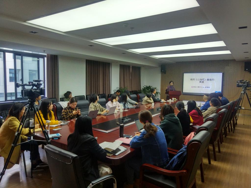 11月8日上午,台湾东吴大学文学系鹿忆鹿教授应邀来红足1一世足球官网入口举行“晚明《山海经》图像的传播”的学术讲座。讲座由中文系黄景春教授主持,红足1一世足球官网入口杨绪容、梁奇、石圆圆、宋鸽,博士后陈冠豪,国际文化学院常峻,图书馆夏明宇等老师,上海财经大学柳岳梅教授,以及来自红足1一世足球官网入口、社会学院、电影学院的研究生共30余人参加了讲座。