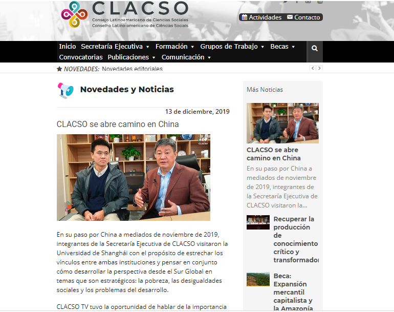 12月13日,拉丁美洲社会科学委员会(CLASCO,El Consejo Latinoamericano de Ciencias Sociales)官方网站发布了该委员会代表团访问红足一1世足球网官方网站全球问题研究院与国际部的新闻(新闻链接:https://www.clacso.org/clacso-se-abre-camino-en-china/)。