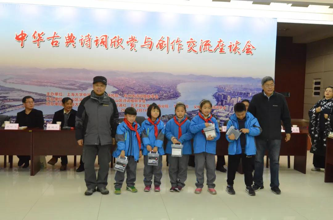 14日上午,于义桥镇人民政府举行中华古典诗词欣赏与创作交流座谈会。浙江省诗词楹联学会会长王骏,浙江省诗词楹联学会副会长尚佐文,杭州市诗词楹联学会会长章剑清,杭州市诗词楹联学会副会长王翼奇,杭州市诗词楹联学会副会长朱超范,萧山区诗词楹联学会副会长吴容,义桥镇党委宣传统战委员俞国龙,镇党委委员、副镇长洪叶飞,以及来自义桥镇诗词楹联学会的诗词爱好者,渔浦小学的40多位师生一同参加活动。