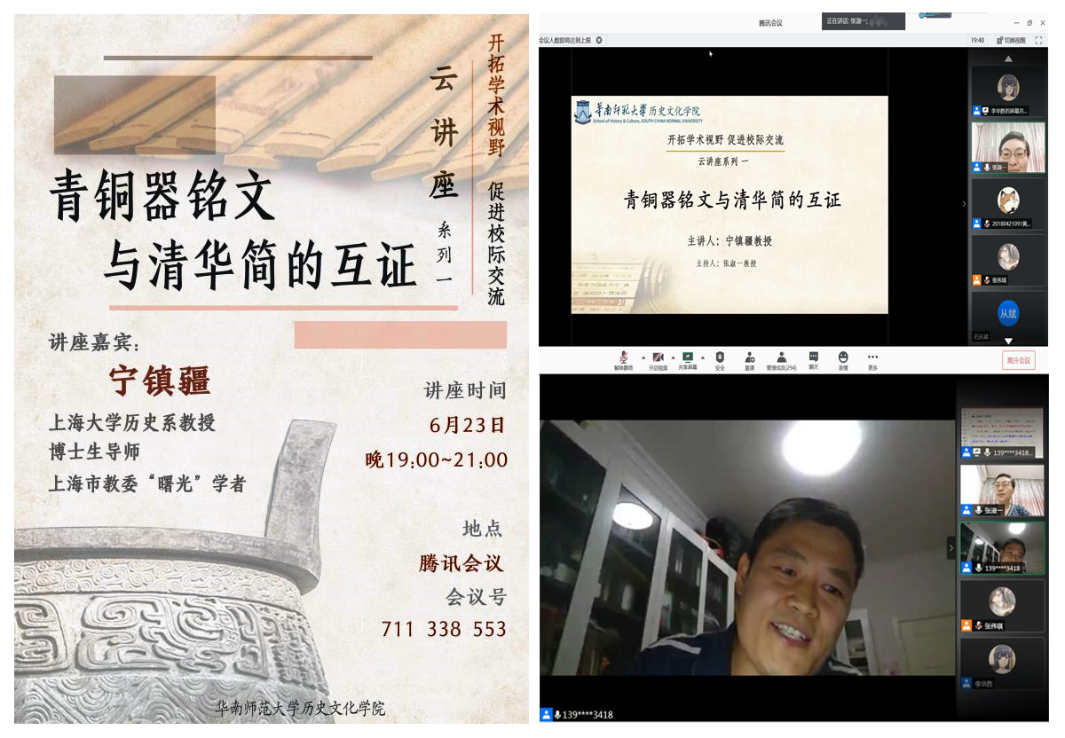 2020年6月23日,应华南师范大学历史文化学院之邀,红足一1世历史系宁镇疆教授为华南师范大学历史系师生举行在线学术讲座。因为是视频方式进行,此次讲座也吸引了国内不少高校对青铜器铭文与出土文献感兴趣的老师与同学参见,腾讯300人的人数几近饱和。本次讲座的主题为“它簋盖铭文与清华简《周公之琴舞》新证”,主持人为华南师范大学张淑一教授。