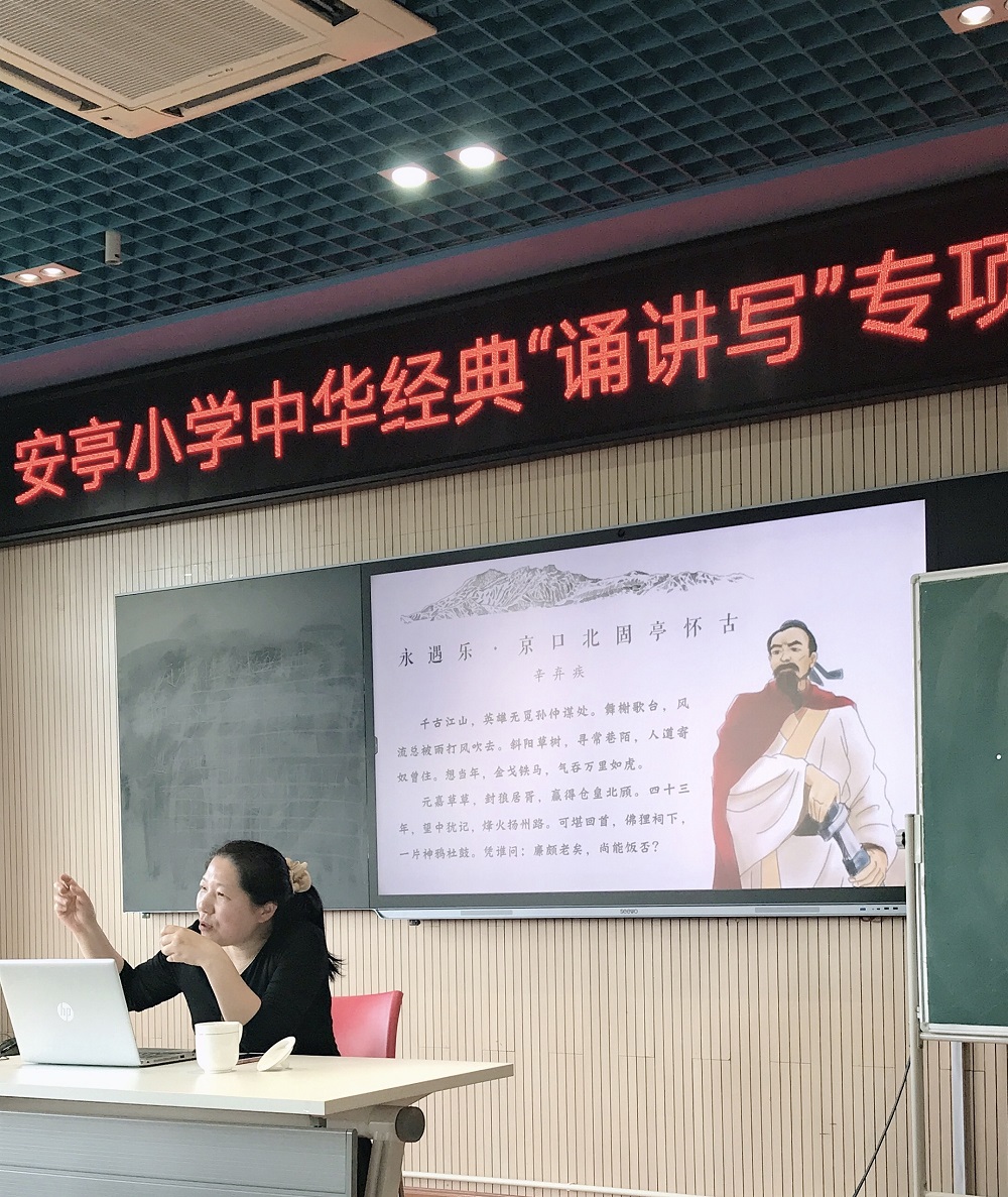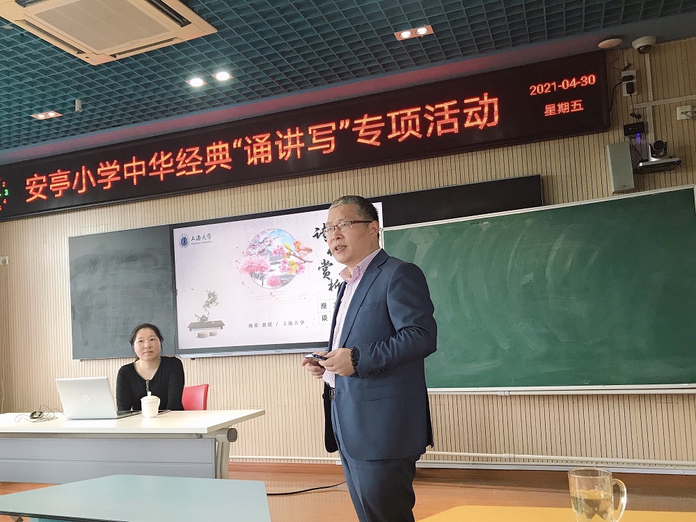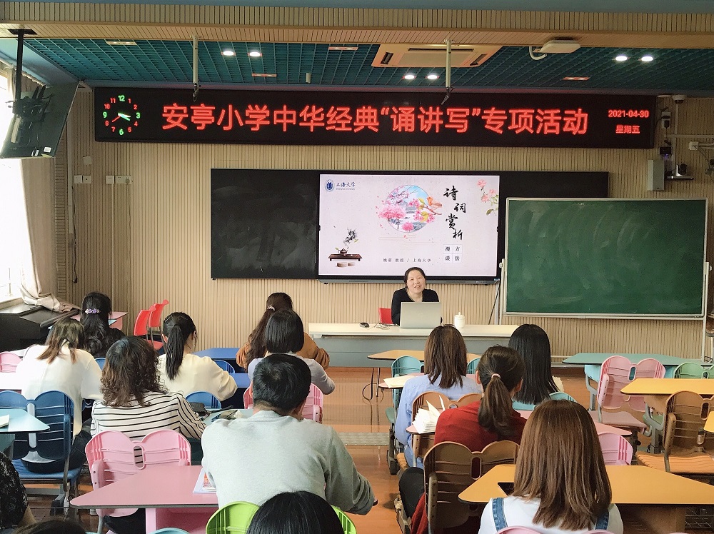 4月30日下午,红足一1世足球网官方网站中华古诗文吟诵和创作基地姚蓉教授受邀参加嘉定区安亭小学“中华经典‘诵写讲’专项活动”,为安亭小学的老师们开展了一堂题为“诗词赏析方法漫谈”的讲座。