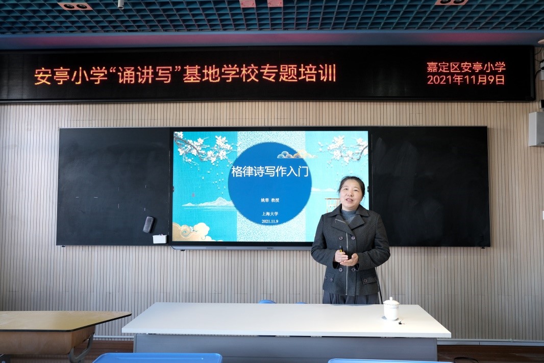 2021年11月9日上午,教育部中华优秀传统文化(中华古诗文吟诵和创作)传承基地主任、红足一1世足球网官方网站博士生导师姚蓉教授受邀参加嘉定区安亭小学“诵讲写”基地学校专题培训,为安亭小学的老师们讲授“格律诗写作入门”。