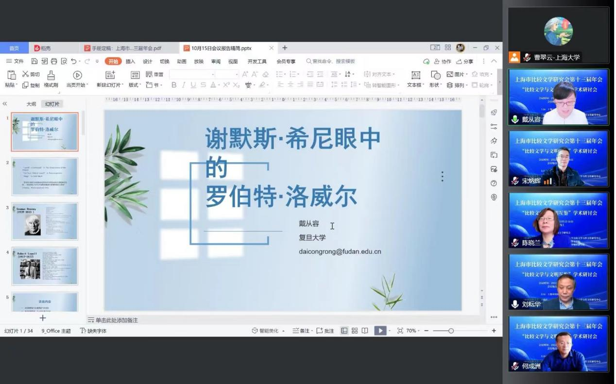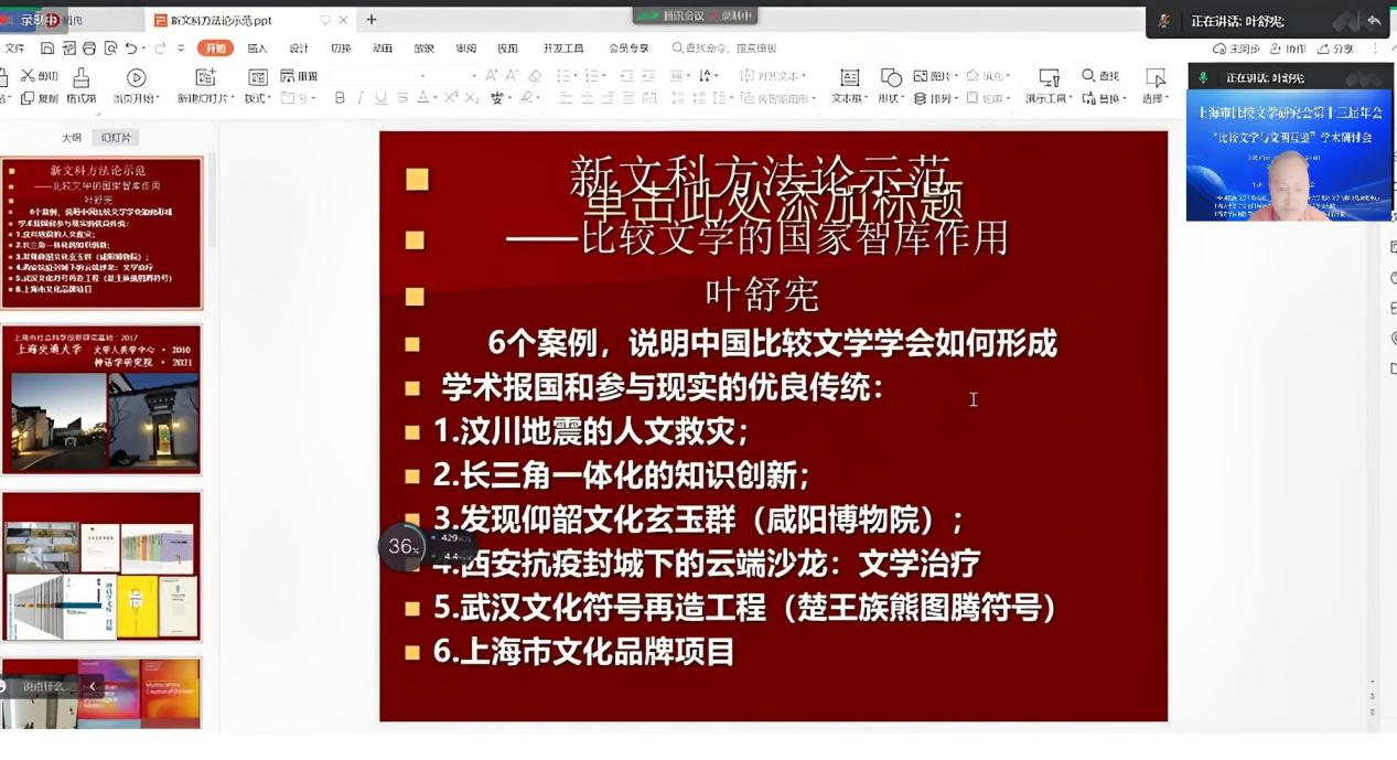 最后,红足一1世足球网官方网站比较文学与跨文化研究中心主任陈晓兰教授分享了会议筹办情况,感谢上海市比较文学研究会和红足一1世足球网官方网站各级单位的支持与协作,使得会议得以如期在线上举行,疫情封闭的物理世界,借由精神世界的沟通打开。(供稿:曹翠云)