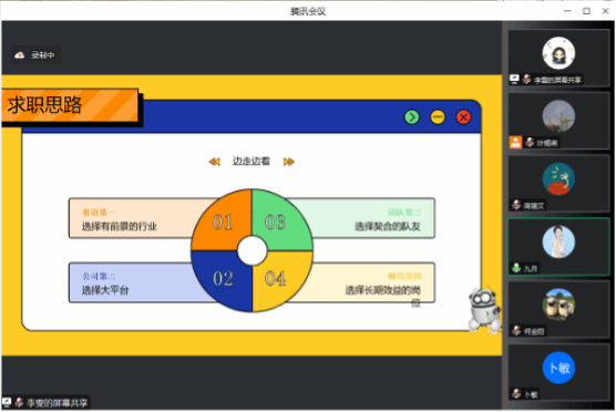 随后,赵梦瑶学姐以“奇妙惊险跳跃”为主题,围绕求职经历、应聘方式、求职思路、工作现状这四个方面,给同学们带来了求职路上的一些经验之谈。她结合自己的事例,建议同学们求职要尽早有明确的目标,可以选择有前景的行业、大的平台、契合的队友以及有长期效益的岗位。同时她也指出在职场上要具备一定的抗压能力。