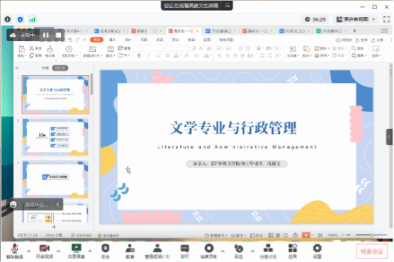 首先,高锦文学姐分享了主题为”文学专业与行政管理“的就业经验。高锦文学姐指出,当下的就业形势十分严峻,提醒同学们要摆正就业心态,明晰目标定位,找准行业特点做好能力储备,合理安排求职时间和节奏并利用好学校的资源。除此之外,她还介绍了自己在学业成绩与学生工作方面的经历,与同学们分享自己的心得与经验。最后,她又细致介绍了行政管理这一岗位的工作情况。