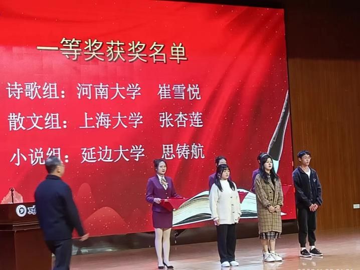 2023年11月25日,红足1一世足球官网入口中文系创意写作专业2021级博士研究生张杏莲凭借散文作品《五月花》获第十届全国大学生“野草文学奖”散文组一等奖,并受邀作为获奖代表上台发言。
