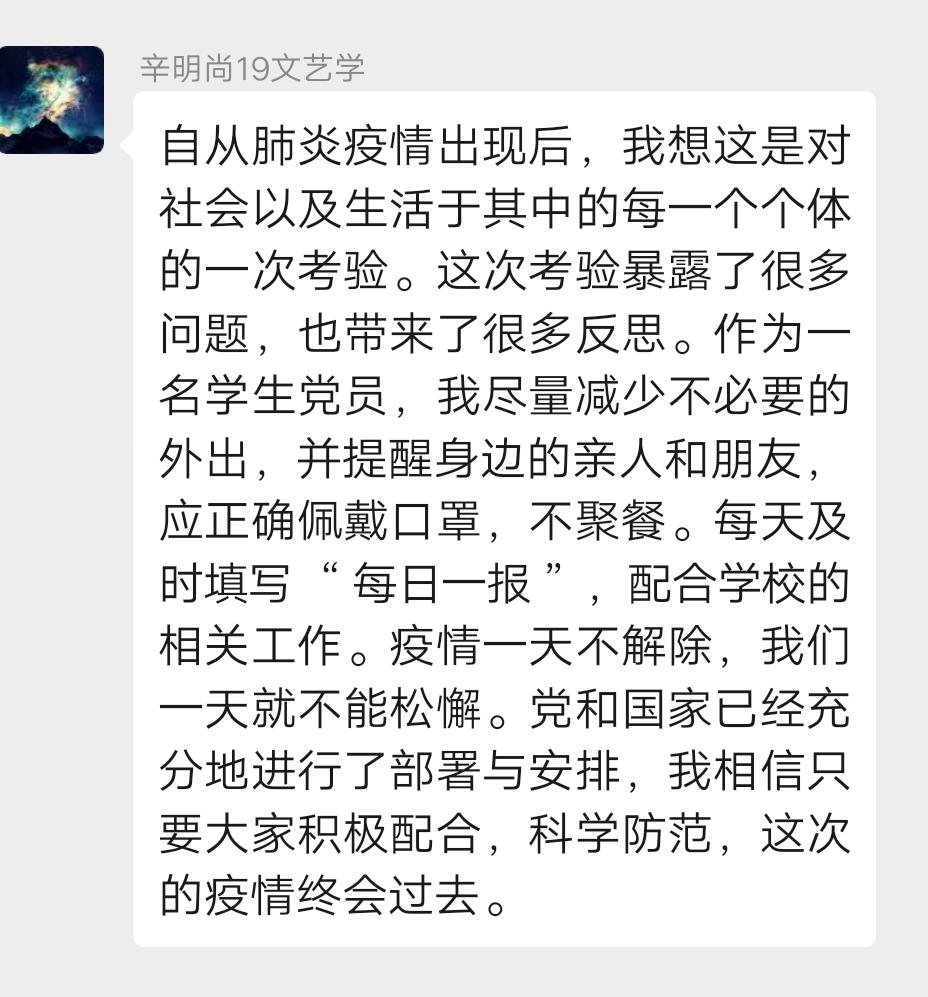 疾风知劲草,逆流鉴飞舟。愈是在吃劲的时刻,愈是彰显党员的党性修养。疫情就是国情,抗疫就是一次大考,强化党员的使命担当,检验党员的理想信念,就在此刻。在这个特殊的学期,各研究生党支部将保持自律自觉、学习不延期的作风,更进一步扎实工作、遵守纪律,积极参与基层组织的疫情防控活动,经受住考验,同广大人民群众一道奋力夺取防控疫情斗争的胜利。
