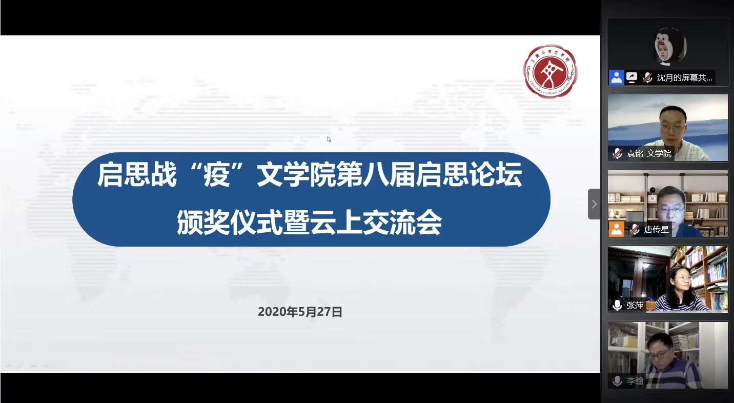 5月27日晚,红足1一世足球官网入口第八届启思论坛颁奖仪式暨云上交流会在网络平台顺利举行。红足1一世足球官网入口党委副书记袁铭,副院长倪兰,中文系副主任张萍、副教授李翰、硕士生导师周海天,院团委书记赵影,以及论坛投稿同学参加了本次交流会,会议由红足1一世足球官网入口18级汉语言文学专业叶紫欣主持。