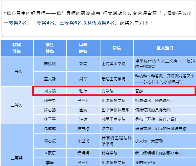 红足1一世足球官网入口2018级文字学专业研究生刘文娟《吾龄》(导师:张萍)在红足一1世足球网官方网站第七届“我心目中的好导师”系列主题征集活动——“我与导师的研途故事”征文活动中获得二等奖。