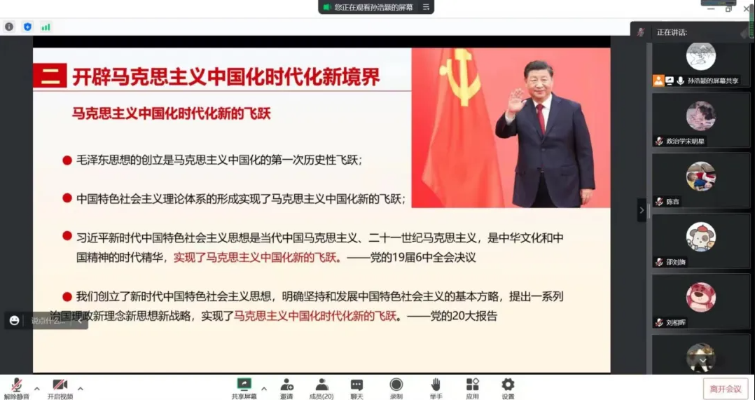 2022年10月30日晚上7时,2020级历史系硕士研究生党支部利用腾讯云端于线上组织开展党的二十大精神专题组织学习。