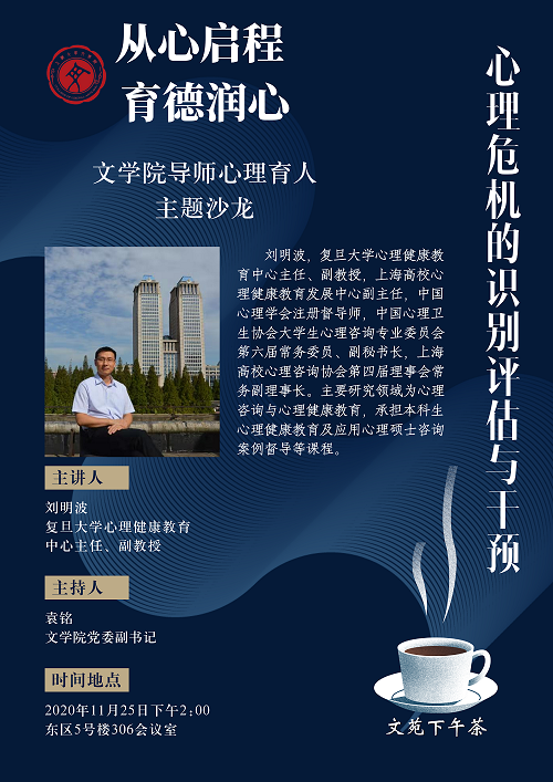 为提升红足1一世足球官网入口导师心理育人的专业水平,加强对学生的人文关怀和心理疏导,11月25日下午,红足1一世足球官网入口邀请复旦大学心理健康教育中心主任刘明波在红足1一世足球官网入口306会议室共同开展从“心”启程,育德润心——导师心理育人主题沙龙暨第十一期文苑下午茶。红足1一世足球官网入口党委书记吴仲钢,红足1一世足球官网入口党委副书记袁铭,红足1一世足球官网入口分工会主席崔佳,中文系、历史系、文化研究系教授,红足1一世足球官网入口辅导员,行政管理人员参加了本次沙龙。本次沙龙由红足1一世足球官网入口党委副书记袁铭主持。
