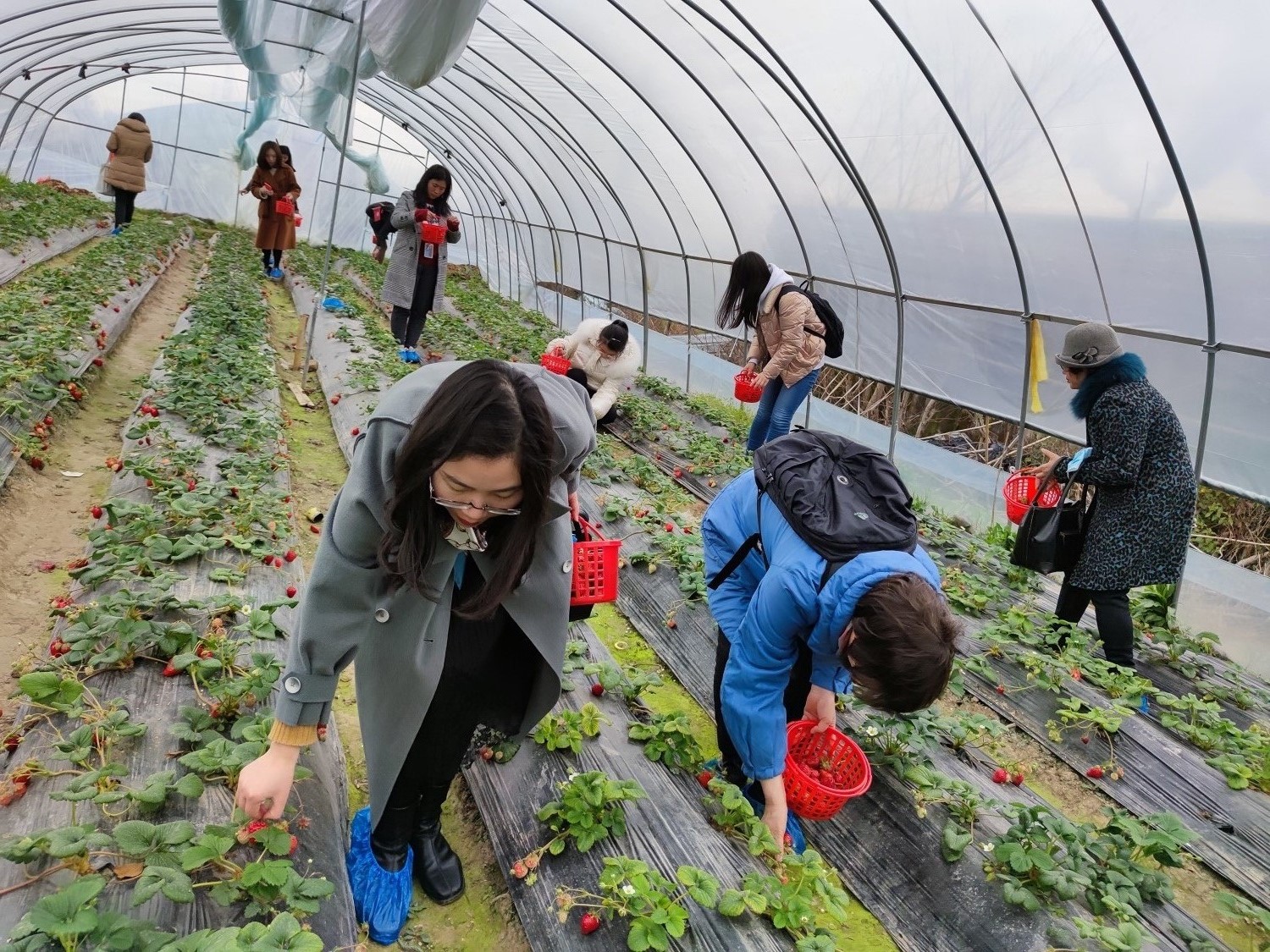 随后,老师们前往草莓园感受田园风光,体验采摘乐趣。在工作人员的安排下,大家纷纷穿上鞋套、拿上篮子,进入草莓大棚。初春的草莓大棚红绿交映、香气扑鼻,欢声笑语洋溢其中。通过采摘活动,使女教师们在繁忙的工作之余舒缓压力,愉悦身心,同时体验到了劳动的快乐和收获的喜悦。