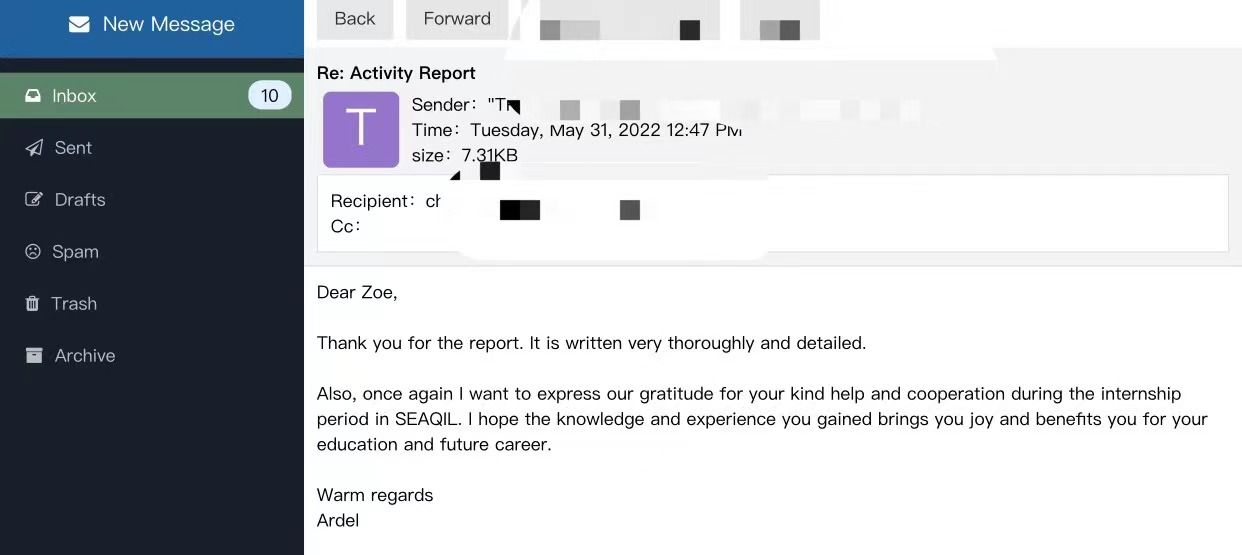 大二的专业课程并不轻松,如何兼顾课业与实习成了实习前心中的顾虑,而实际开始实习后,通过不断探索和实践,逐步找到了学习和工作之间的平衡。虽然由于疫情的原因,远程实习变成了国际组织实习的主要方式之一,但线上工作的优势也在此尽显,远程实习省去了通勤时间和路费的消耗,使我们的工作时间更加灵活。在特定的时间参加预定好的会议,也让我们有更多的时间进行备课,提升工作效率。倘若在过程中遇到突发事件,也可及时向主管询问或沟通,在实习期间,在与主管和其他工作伙伴定期沟通的过程中,也逐步提升了自己的跨文化交际能力,不论何种语言,也不管身在何处,以真诚和理解为基础的沟通总是解决问题的法宝。