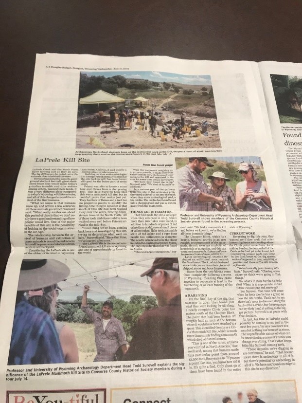 美国人常常外出露营,团队里只有我不会搭帐篷,在此感谢怀俄明大学给我提供的帐篷和睡袋等用具,也感谢大家帮我搭好帐篷。扎营结束后我们来到不远处的遗址,Todd给我们讲了此处遗址的大致情况,有猛犸象的遗迹。午饭后,我们开始进行发掘。每人被分到一个一平米左右的探方。我们的遗址还被当地媒体进行报道,并在报纸头版发了近两版报道。Todd也接受了采访。